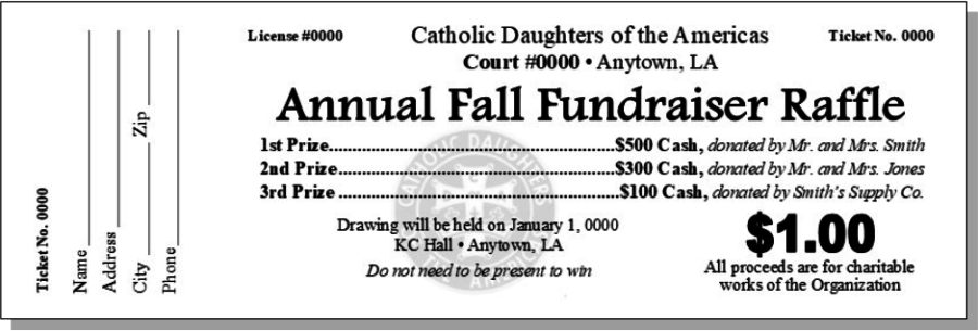 Your raffle tickets will come made to your specifications complete with perforation and stapled into a book with the number of tickets you choose, from a count of 5 to 25.